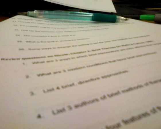 This week as been crazy and I needed to take a break from my project to focus on my schoolwork. I hope to continue to post everyday but when I need to focus on a midterm, I need to do that. The recent "Day 58" photo is horrible but that's basically how my head felt. That was only part of the study guide for the midterm. Ugh. Anyway, time to move on. And time to do more homework - yes.